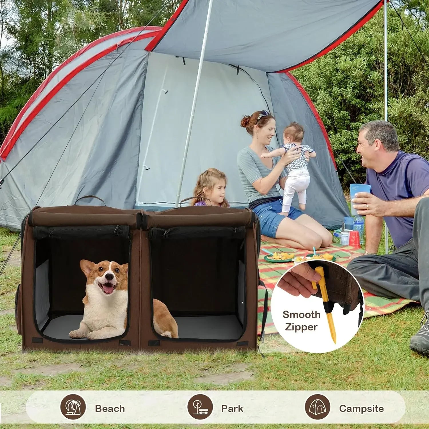 40 Inch Cat Carrier with Double Compartments, Portable Pet Kennel with 2 Removable Hammocks, Dual-use Mats & Litter Box, Soft-Sided Cat Dog Crate with Carry Bag & Ground Stakes (Brown)