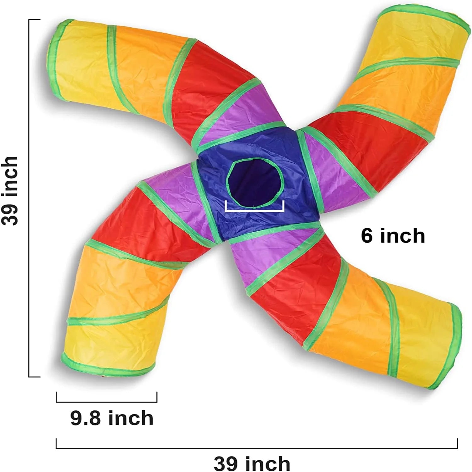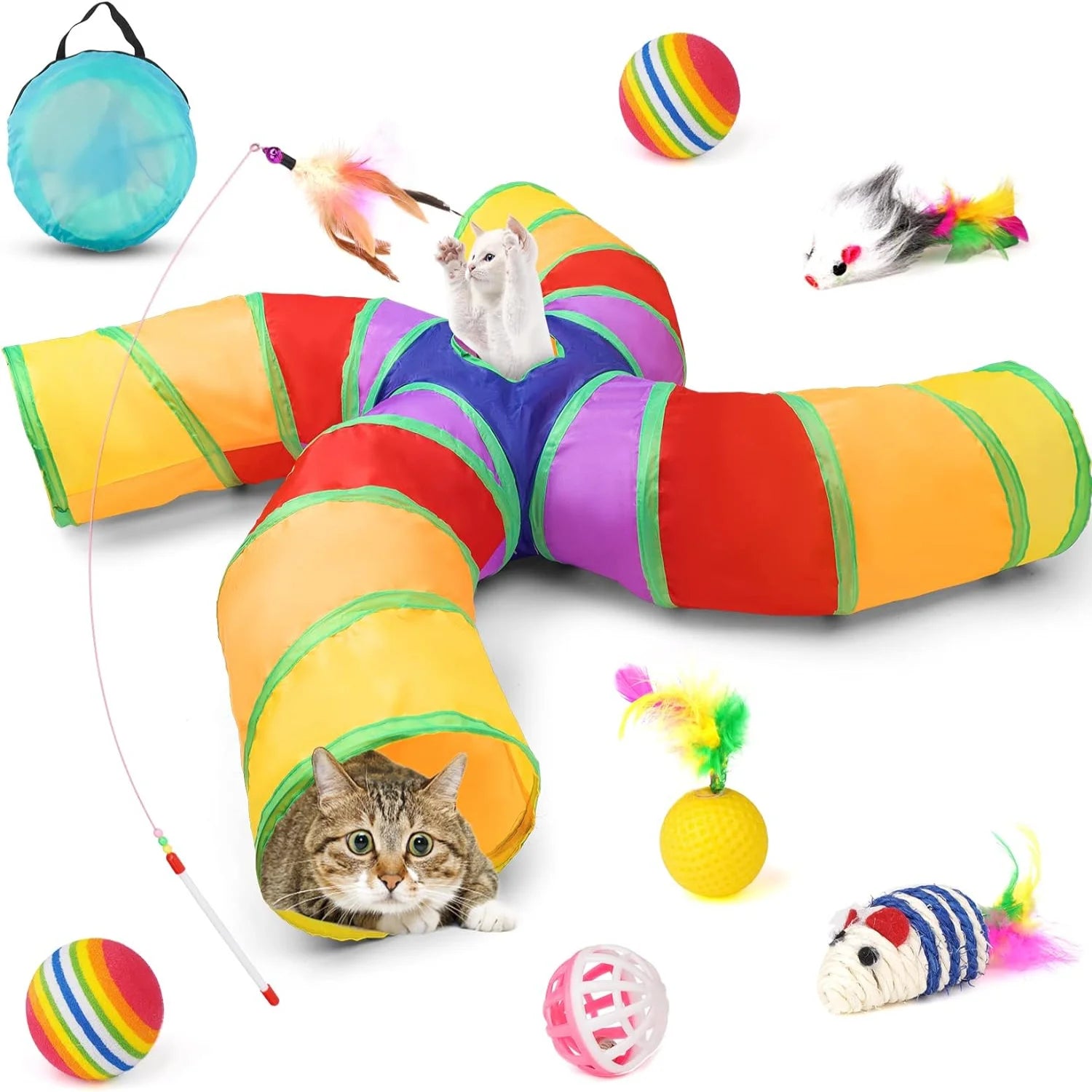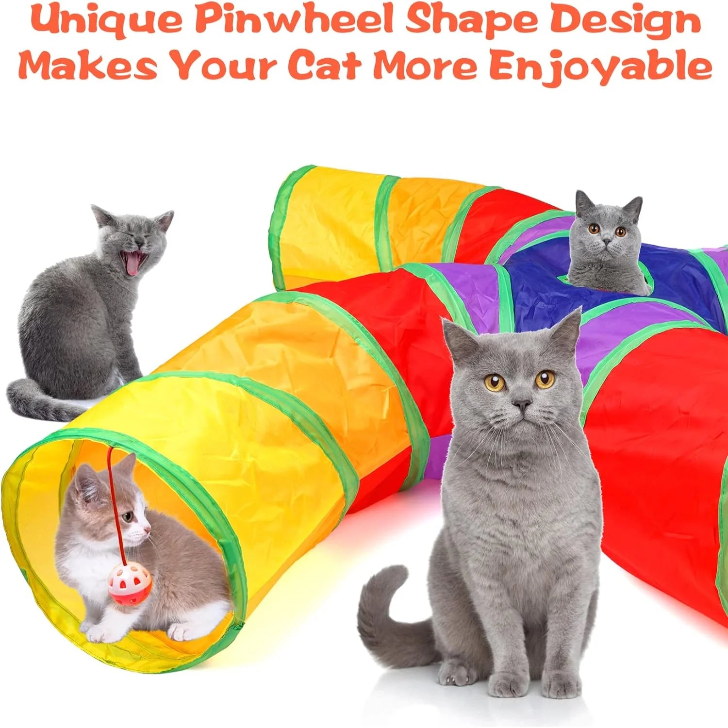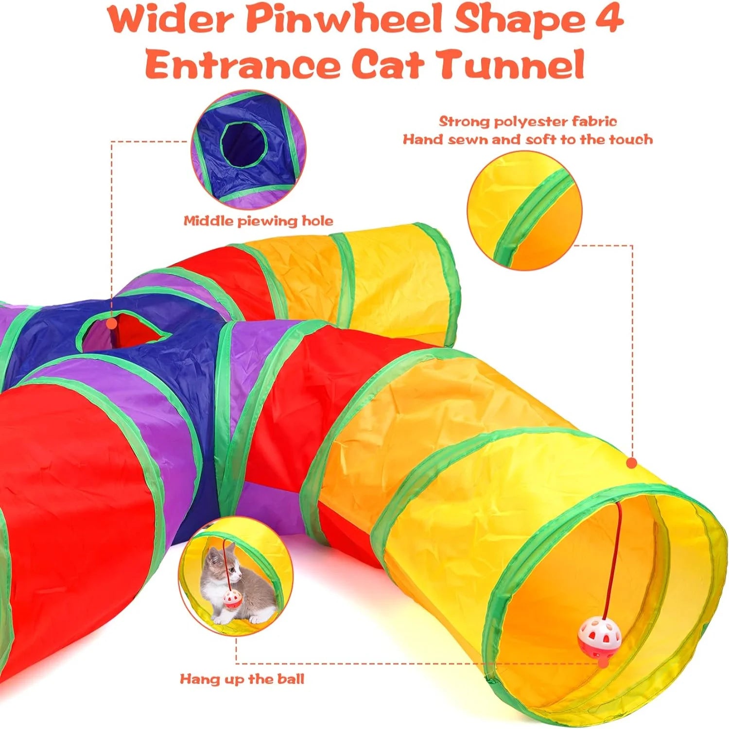 Enticing Collapsible Cat Tunnel Set with 4 Entrances - Rainbow Pinwheel Shape - Includes 11 Catnip Toys - Interactive Indoor Pla
